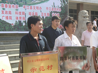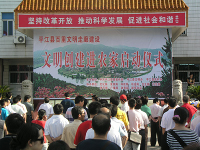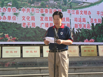 本报讯 (特约记者 黄振) 7月20日,平江县委机关气球高悬、彩旗飘扬、锣鼓喧天,当地近千名干部群众共同参与“百里文明走廊建设——文明创建进农家”启动仪式,10个文明创建示范村和10个村级图书室正式授牌。当天,各相关单位还前往伍市镇长明村示范点开展了系列文明创建活动,80户“十星级文明户”得到表彰,标志着该县创建“百里文明走廊”正式启动。