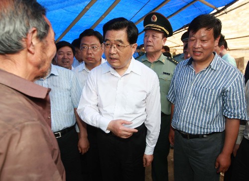 5月31日,中共中央总书记、国家主席、中央军委主席胡锦涛前往陕西地震重灾区汉中市,察看灾情,指导抗震救灾工作。这是胡锦涛在宁强县广坪镇金山寺村同受灾群众亲切交谈。新华社记者 鞠鹏 摄