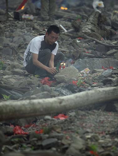 5月11日,一名男子在北川祭奠亲人。5月10日下午14时至5月13日15时,北川老县城管制区域在汶川地震一周年之际再度有限开放,方便当地群众开展祭奠活动。 新华社记者 邢广利 摄