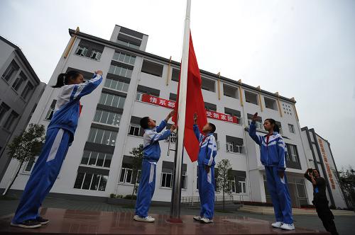 5月9日,四川省都江堰市绿地土桥小学的入学仪式上举行升旗仪式。当日,由上海援建的都江堰绿地土桥小学正式竣工交付并举行入学仪式。这是都江堰灾区第一所开工建设、第一所交付使用的永久性学校,同时也是上海对口援建都江堰工程中最早竣工的项目。绿地土桥小学位于都江堰市崇义镇,占地约24亩,总建筑面积约4800平方米,建有教学楼、图书室、食堂等7幢建筑,并配有200米标准塑胶跑道、2个羽毛球场和1个篮球场等设施。该校容纳12个班500余名学生就读,全部建筑抗震设防烈度均达8度。 新华社记者 江宏景 摄