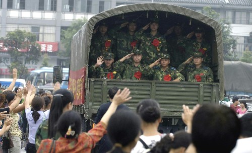 8月21日,都江堰人民挥手送别成都军区空军抗震救灾部队。当日,驻扎在都江堰的成都军区空军抗震救灾部队圆满完成抗震救灾任务,正式回撤。数百名当地群众冒雨前往送别。新华社记者 海明威 摄