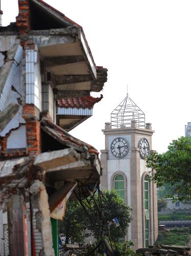 这是5月3日拍摄的绵竹市汉旺镇废墟和钟楼。四川省绵竹市汉旺镇在汶川地震中严重受灾。如今,经过江苏援建者近一年的努力,一座汉旺新镇正在崛起。 新华社记者 陈燮 摄