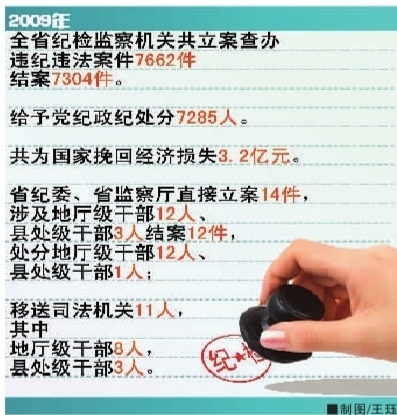 2009年,全省纪检监察机关共受理群众来信、电话、网络举报41468件,立案7662件,结案7304件,给予党纪政纪处分7285人,其中,地厅级干部12人,县处级干部195人,移送司法机关357人。为国家挽回直接经济损失3.2亿元。省纪委、省监察厅直接立案14件,涉及地厅级干部12人、县处级干部3人,结案12件,处分地厅级干部12人、县处级干部1人;移送司法机关11人,其中地厅级干部8人,县处级干部3人。