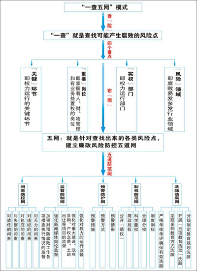 坚决惩治和有效预防腐败,关系到人心向背和党的生死存亡,关系到中国特色 社会主义事业的兴衰成败,是党必须始终抓好的重大政治任务。为了更好地贯彻落实“标本兼治、综合治理、惩防并举、注重预防”的方针,拓展从源头上防治腐败工作的领域,更加有效地预防腐败。我们坚持以更高标准、更严管理、更具公信力,深入推进惩治和预防腐败体系建设,建立廉政风险防控长效机制,推行“一查五网”模式,即“查找风险点,布防‘洗脑防腐、制权防范、预警防护、监督防制、问责防控’五道防范控制网”,预防腐败行为发生。