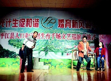 今年来,我县为把计生各项政策宣传出去,促进群众转变生育观念,引导群众自觉实行计划生育,县人口计生局、计生协会充分利用“花鼓之县”的优势,以及群众对花鼓戏的喜爱,由县人口计生局、计生协会出资10万元,由县花鼓戏团承办,编排了《哥哥嫁给独生女》、《送鸡汤》、《朱村长抓计生》、《只怪爹娘生得多》等10个通俗易懂、群众喜闻乐见的计生节目,将婚育新风、依法行政、奖励扶助、少生快富、优育优教等多种人口计生工作内容融合于花鼓戏中,用群众喜闻乐见、通俗易懂、用诙谐幽默的土话方言等方式,加强计划生育基本国策的宣传力度,提高群众政策知晓率,积极倡导婚育新风,促进育龄群众婚育观念转变,引导群众自觉实行计划生育。