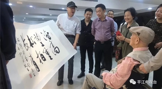 在平江县周令钊美术馆,周令钊一一浏览自己的画作,与大家分享创作的点点滴滴。尽管年事已高,但说起画画,他依然精神矍铄,思路清晰。周令钊的到来,吸引了很多粉丝,大家纷纷围过来拍照合影、找他签名、请他指导。