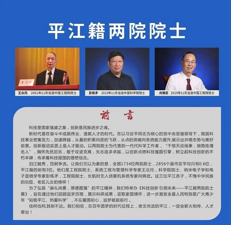 8月18日,平江籍中国科学院、中国工程院院士展在县档案馆开展。展览主题为“科技创新、引领未来”,展览主要介绍平江籍中国工程院院士王众托、中国科学院院士彭练矛、中国工程院院士向锦武三位院士的光辉事迹。中国科学院院士彭练矛亲临开展仪式。县领导汪涛、洪志凡、凌晓明、彭喜丰出席。
