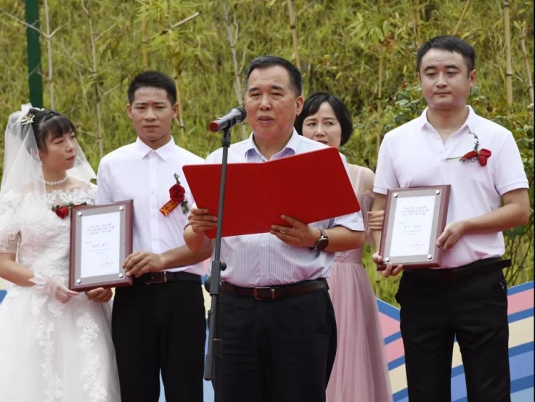 县委副书记肖湘晖在致辞中表示,今天,20对优秀新人在重温红色爱情故事中、在传统经典诗词熏陶中举行集体婚礼,这种个人与集体相契合、传统与创新相结合、家庭与社会相融合的活动方式,必将助推传统文化绵延赓续,必将助推红色文化发扬光大,必将助推文明新风惠及千家万户,也必将为建设绿富双赢新平江增添新的活力和动力。