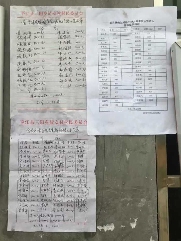 事情回到1999年的年关,三阳乡当时的一个生产队和金华小学同时收到了一笔捐款,捐款人处签写着“童育林”三个字。