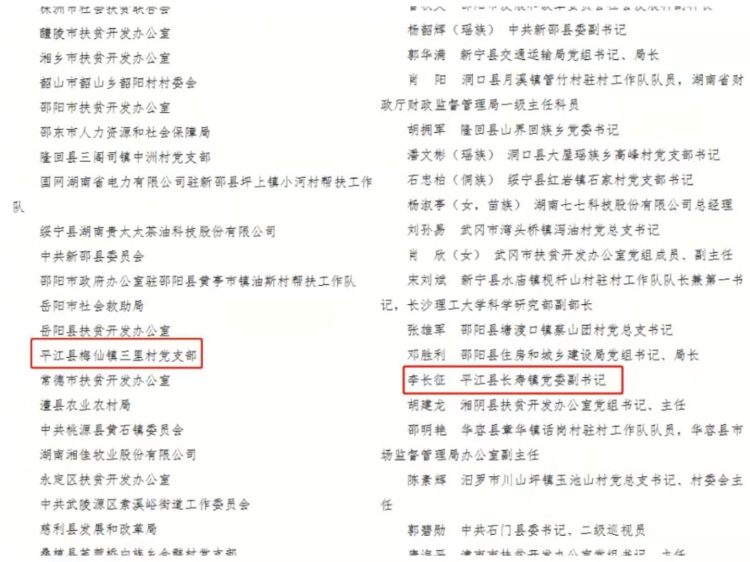 近日,省扶贫办发布了湖南省参加全国脱贫攻坚总结表彰评选拟推荐对象公示名单(90名个人、67个集体)。其中,中共平江县梅仙镇三里村支部委员会入选全国脱贫攻坚先进集体,平江县长寿镇党委副书记李长征入选全国脱贫攻坚先进个人。