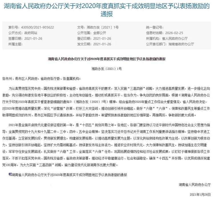 近日,湖南省人民政府办公厅印发《关于对2020年度真抓实干成效明显地区予以表扬激励的通报》,对2020年度推动高质量发展、深化“放管服”改革、打好三大攻坚战、推动创新引领开放崛起、做好“六稳”“六保”、保障和改善民生等重点工作取得明显成效的市州、县市区和园区予以通报表扬,并给予激励支持。