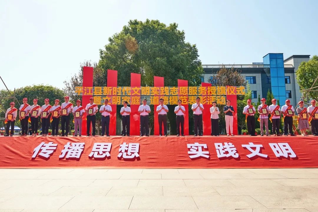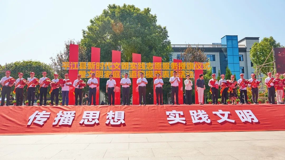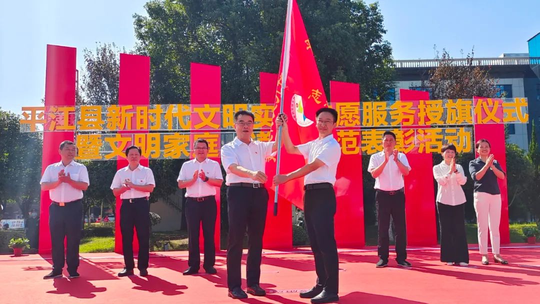 9月22日,在平江县天岳广场,随着志愿者庄严的誓词,平江县新时代文明实践志愿服务授旗仪式暨文明家庭、道德模范表彰活动举行。县委书记李勇,县委副书记、代县长彭方建,县领导胡伟、潘岳清、田浩、李泓、潘如意、周晓辉出席。