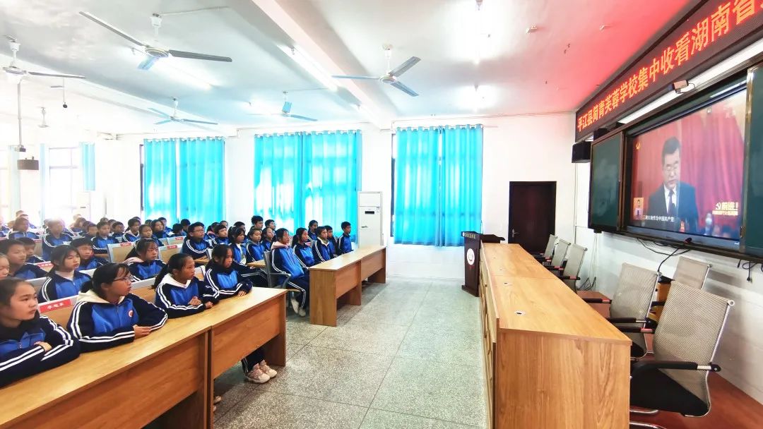 ▲平江县芙蓉简青学校师生集中收看湖南省第十二次党代会开幕式