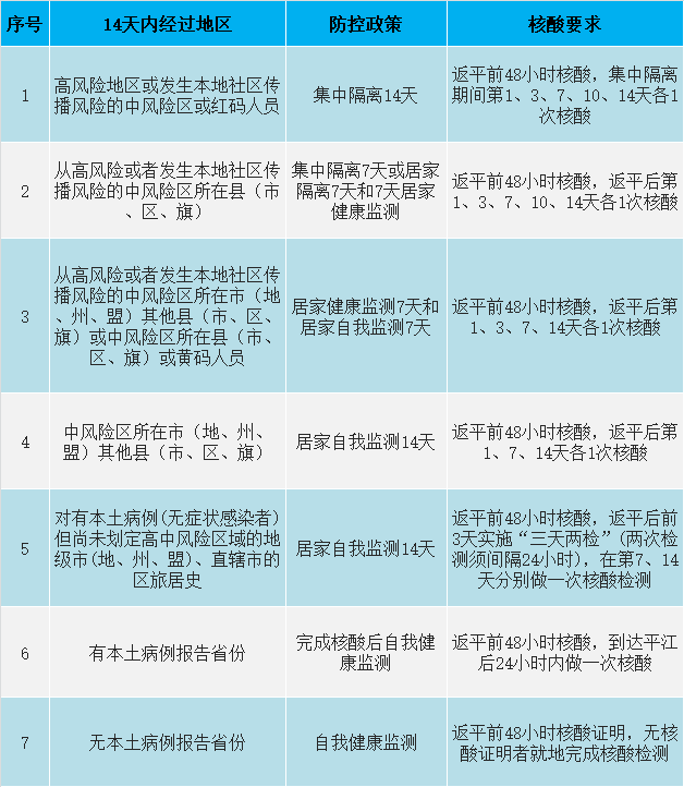答:如有上述情况,实行14天集中隔离医学观察和7天的居家健康监测,集中隔离期间完成一天一检核酸检测。