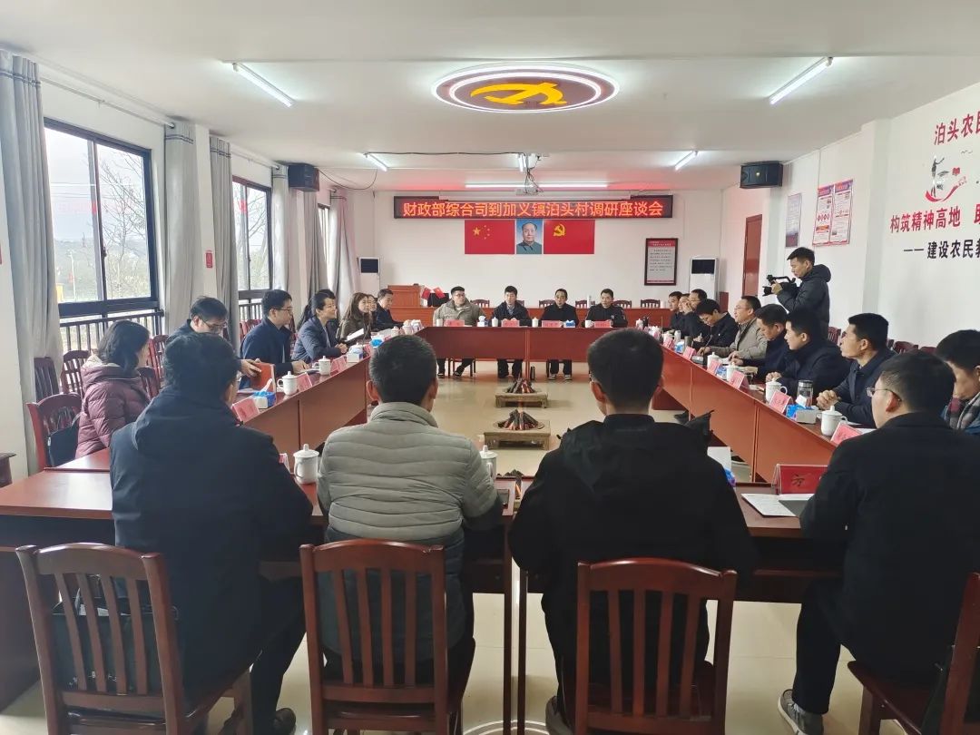 在加义镇泊头村召开的座谈会上,彭方建作县情汇报,财政部驻加义镇泊头村第一书记谢思晓作工作汇报,加义镇作工作情况汇报。
