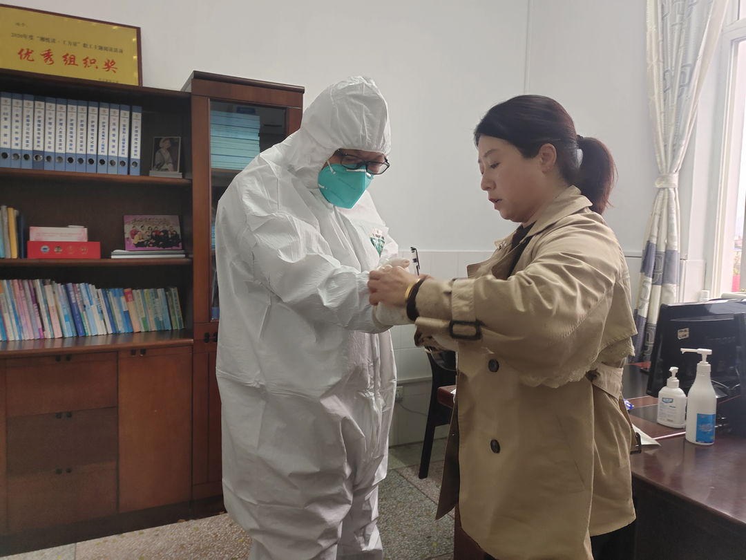 图为平江县第四人民医院护士长张尾芝指导同事穿戴防护服