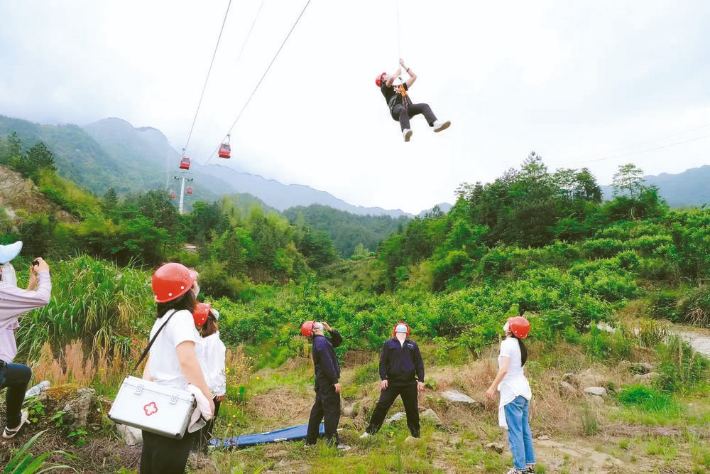 演练模拟天岳大索道发生两次停机故障,两批次共四位“游客”陆续被困在险谷以及缓坡之上的高空吊厢。接到应急指令后,景区马上启动广播系统对游客进行安抚,同时救护人员即刻组队,携带专业装备出动。救护人员根据现场条件,分别采取垂直救护与水平救护的方式实施救援,空中救护人员和地面救护人员紧密配合,将“被困游客”安全转移到地面。一场演练遭遇了阴天与大雾气候两个场景,但实施的两次救援各环节协作人员配合快捷得当,整个演练达到预期效果。(岳阳日报 尹明伟)