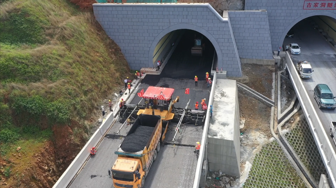 ▲7月8日中午,工人们在古家洞隧道摊铺沥青
