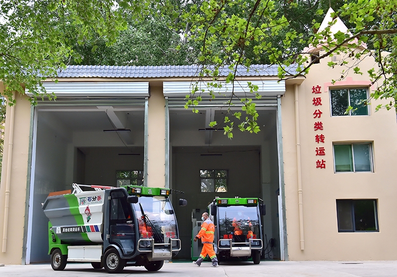 工作人员在河北省石家庄市鹿泉区镇宁路上的一处垃圾分类转运站处理垃圾(2022年4月21日摄)。新华社记者 杨世尧 摄