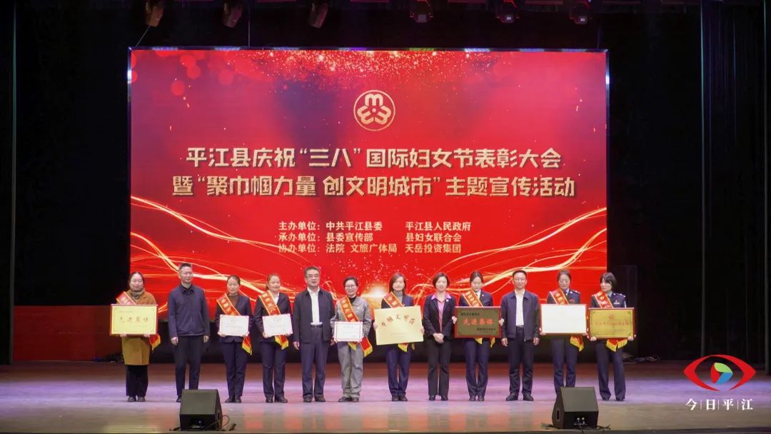 会议隆重表彰了2022年度全国巾帼文明岗、全国巾帼建功标兵、湖南省巾帼建功先进集体、岳阳市三八红旗集体、岳阳市三八红旗手、岳阳市巾帼建功先进集体。2022年度平江县清廉家庭、三八红旗集体、三八红旗标兵、三八红旗手、巾帼建功集体、巾帼文明岗、优秀巾帼志愿服务队、巾帼建功标兵和五好家庭、最美家庭、好婆婆、好媳妇。全国巾帼建功标兵张琳宣读了《平江县”聚巾帼力量 创文明城市”倡议书》,倡导全县妇女们在共建共享文明城市中,彰显巾帼风采,展示家庭风范,为我县创建全国文明城市贡献巾帼力量。
