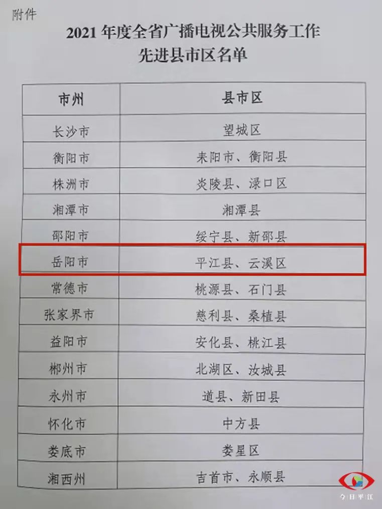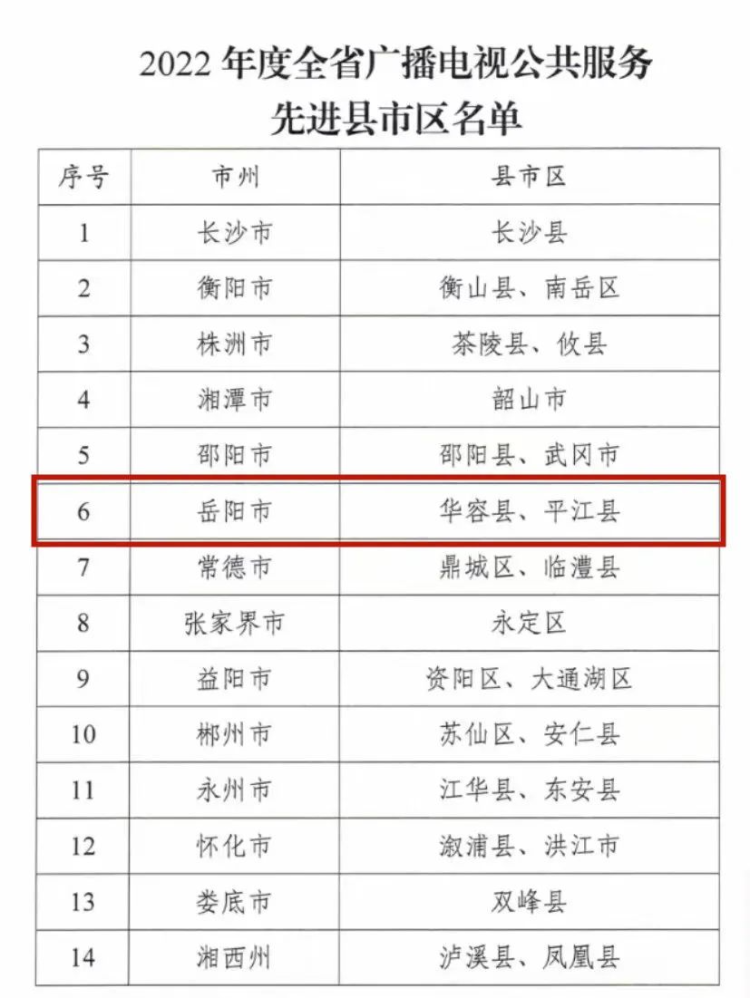 近日,湖南省广播电视局公布2022年度全省广播电视公共服务先进县市区,24个县市区获奖,平江县名列其中,并受到通报表彰。这是我县连续两年获此殊荣,是对我县高度重视广播电视公共服务体系建设的充分肯定。