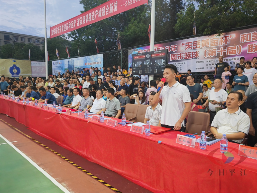 7月16日晚,平江县 2023 年“天岳黄金杯”和美乡村(村BA)周末篮球(第十届)联赛开幕式在天岳广场举行,县委副书记、县长彭方建,县委副书记、政法委书记鲁勇,副县长李三军出席。