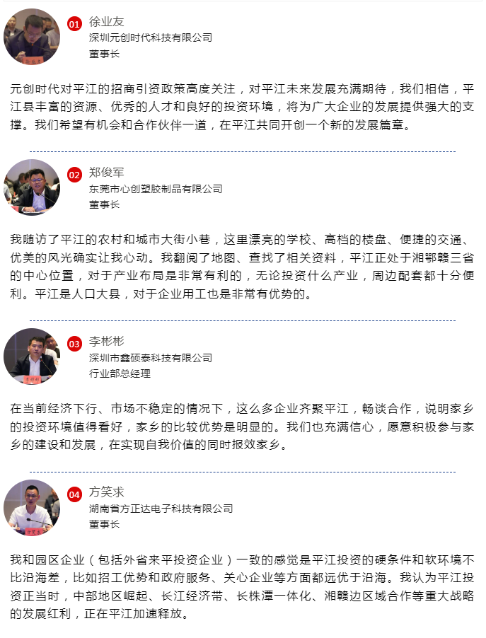 元创时代、心创模具、鑫硕泰等企业代表在会上发言,畅谈了对平江的期盼,表达了投资意向,表明了企业愿景。方正达企业回平江发展已经12年,作为平江电子信息产业的领军代表,企业负责人分享了在平江投资创业的成功经验。