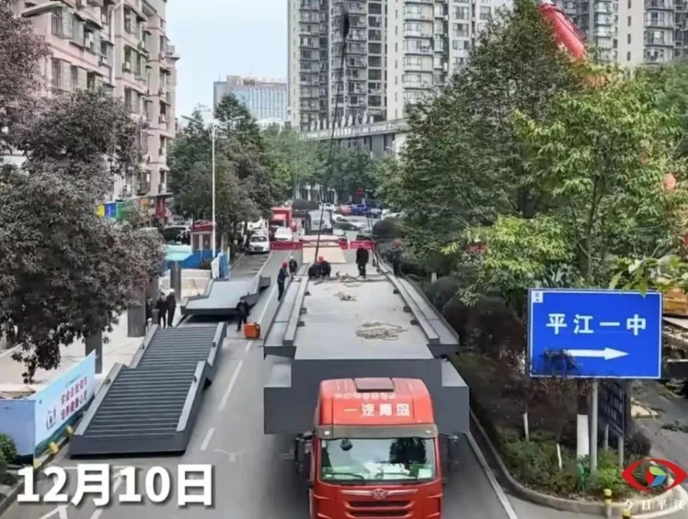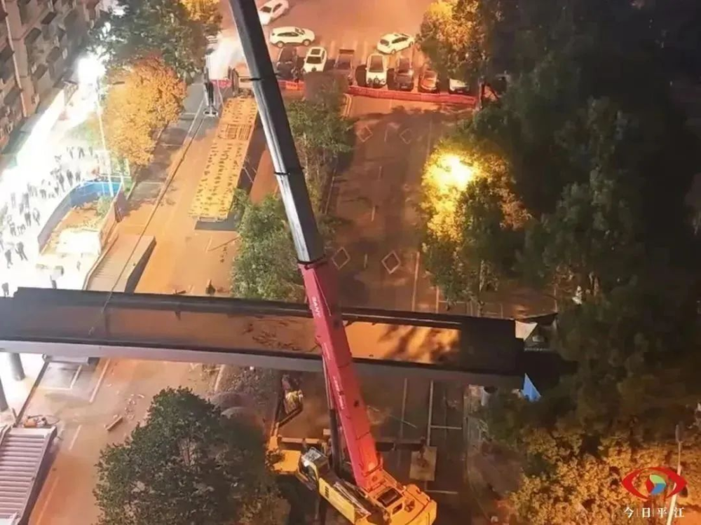 12月10日,记者来到了平江一中前,只见运载着钢箱梁的车辆驶入施工现场,在大型起重机的作业下,巨大的钢箱梁缓缓升起,起重机和施工人员精密配合,历经四个小时左右的时间,平江一中人行天桥工程,桥梁主体钢结构顺利合拢。