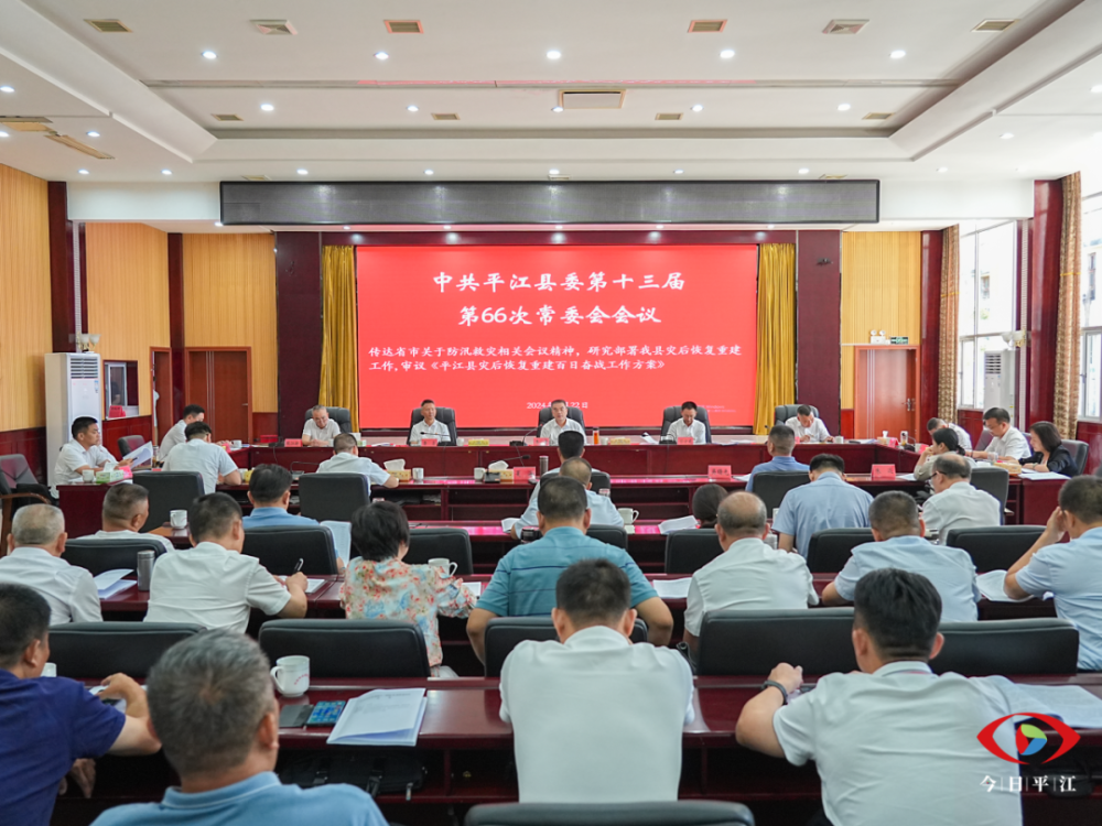 会议传达学习了省市关于防汛救灾的相关部署要求和会议精神,审议了《平江县灾后恢复重建百日奋战工作方案》,研究部署全县灾后恢复重建工作。会议指出,要坚持实事求是,务求工作精准,抓住关键任务,以群众的满意度作为检验工作成效的标准;要全面回顾总结,提升工作水平,不断提高灾后重建工作的科学性和有效性;要遵循公开透明,守牢工作底线,及时公布救灾资金、救灾物资使用发放情况和救灾帮扶政策落实情况;要强化协同联动,形成工作合力,既各负其责,又密切协作,实现信息互通、资源共享;要全面认领任务,压实工作责任,确保各项救灾工作高效推进;要做好典型示范,推介工作经验,发挥先进事迹、创新举措的引领带动作用;要加强督导考核,确保工作实效,全力做好灾后恢复重建工作。