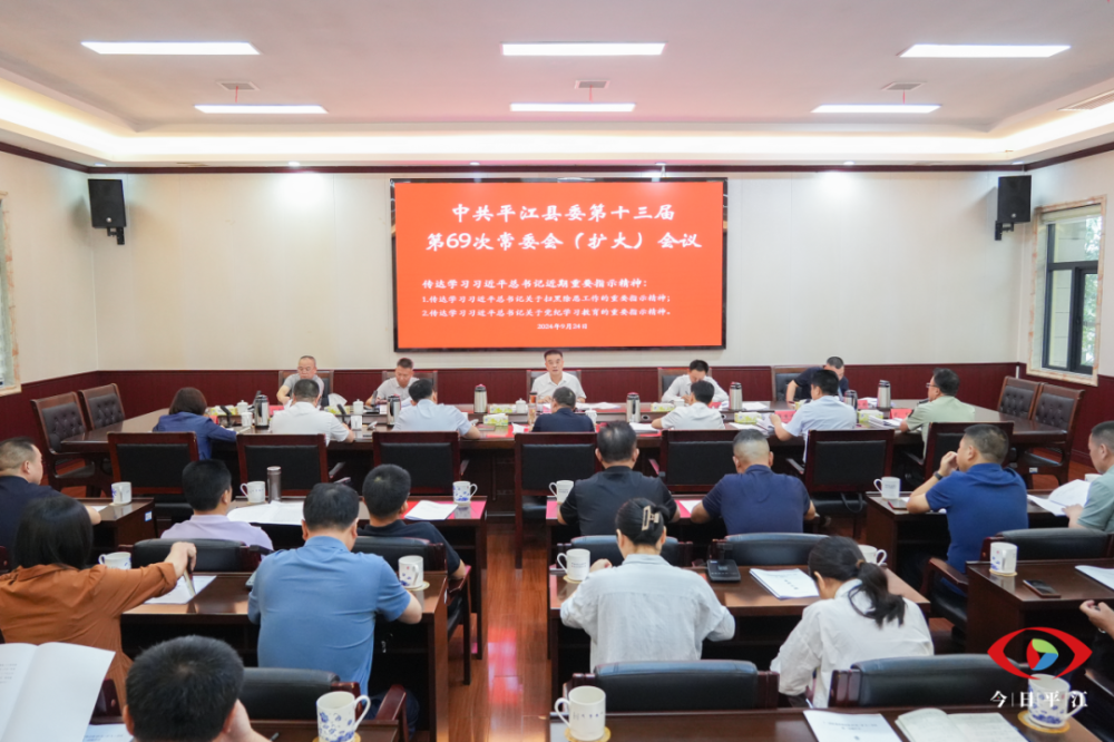 9月24日,中共平江县委第十三届第69次常委会(扩大)会议召开,传达学习了习近平总书记近期重要指示精神以及中央、省、市相关会议精神和工作要求,研究党纪学习教育、整治形式主义为基层减负、年度综合绩效评价、纪检监察、全面依法治县等工作。县委书记李勇主持并讲话。