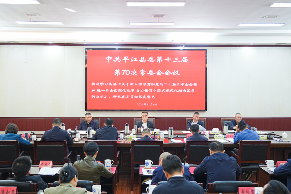 11月4日,中共平江县委第十三届第70次常委会会议召开,传达学习了习近平总书记近期重要指示精神、省市相关会议精神和市委书记谢卫江来我县调研指示精神,研究我县贯彻落实意见,听取民族宗教、村级债务化解、矿权延续变更登记等工作情况汇报。县委书记李勇主持并讲话。