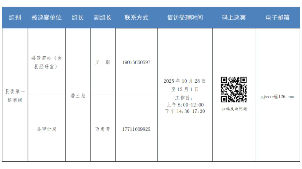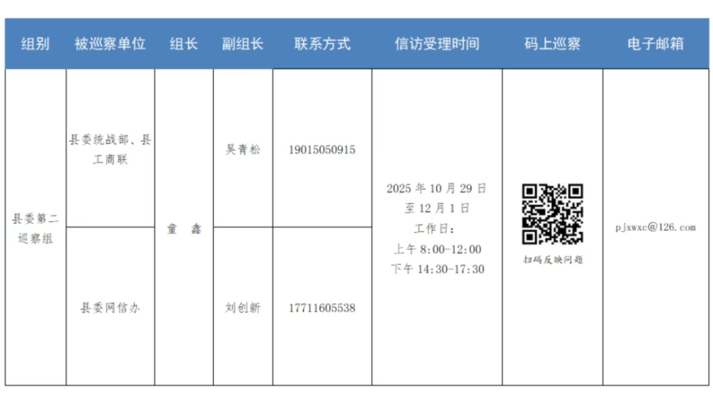 据悉,第二批巡察时长为25个工作日,巡察期间,2个巡察组分别设立专门值班电话、信访邮箱和“码上巡察”二维码,主要受理反映被巡察党组织领导班子及其成员、下一级党组织领导班子主要负责人和重要岗位机关干部职工问题的来信、来电、来访,重点是关于违反政治纪律、组织纪律、廉洁纪律、群众纪律、工作纪律、生活纪律和中央八项规定及其实施细则精神等方面的举报反映。不属于巡察受理范围的信访问题,将按规定转交相关部门单位受理。巡察组受理信访截止时间为2025年12月1日。