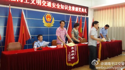 8月7日上午,平江县首届网上交通安全知识竞赛颁奖典礼在平江大队举行,县委宣传部副部长、县文明办主任余爱华,县文明办副主任朱伍平、县法治办副主任戴奇新、县公安局副局长王槐欣等领导出席仪式,参加仪式的人员有县教育局干部职工、华腾汽运公司职员、平江七兴公司职员、平江一中师生及部分交通民警。