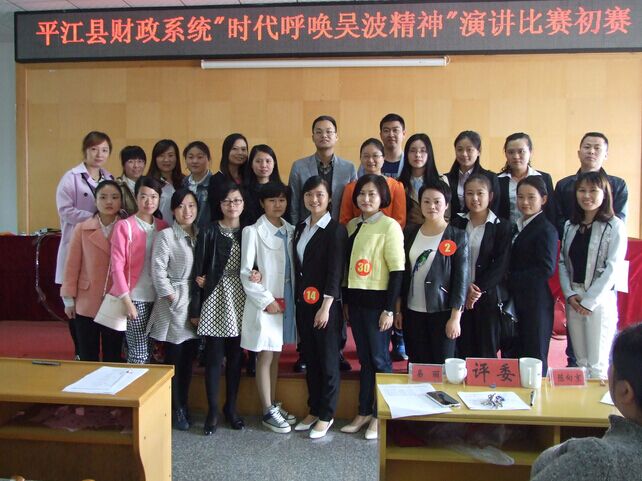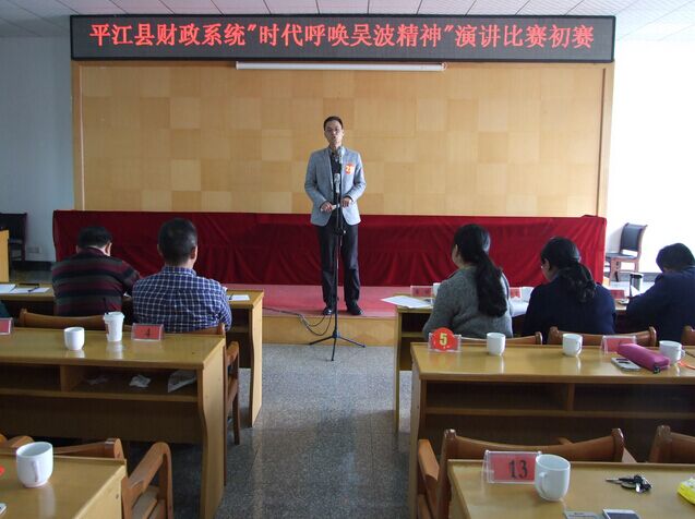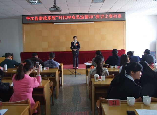 为响应财政部《关于在全国财政系统开展向吴波同志学习活动的通知》号召,在全县财政系统掀起学习吴波精神的热潮,4月22日上午,县财政局在七楼大会议室举行全县财政系统“时代呼唤吴波精神”主题演讲比赛活动,局机关和各乡镇财政所共有42名选手参加。经过一番激烈角逐,国库集中支付局吴兰等13名选手脱颖而出,进入下轮决赛。