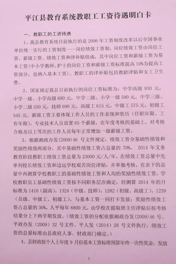 平江作为一个典型的山区县、国贫县,在想方设法保障教师待遇方面做了很大的努力。近年来,义务教育阶段教师的基本工资、“五险一金”、绩效工资(2014年人均23000元)和第13个月工资全部按政策落实到位,教师平均工资待遇比2008年翻了一番,边远山区教师2014年增至200元/月和骨干教师津贴得到有效保障,2014年初预算高中教师绩效工资7200元,提标后增至13800元。