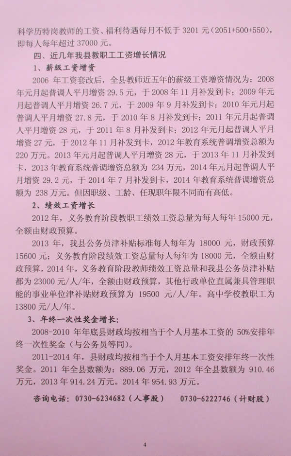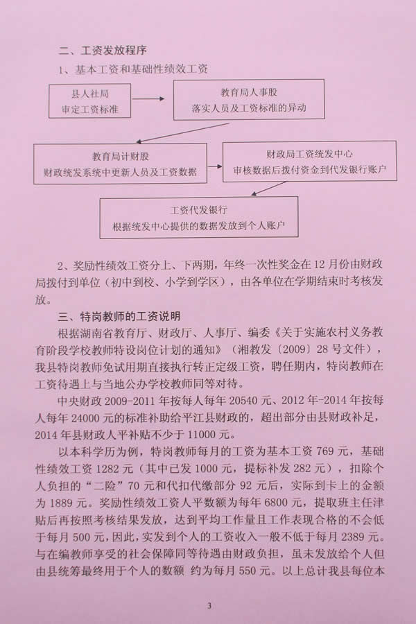 近日,平江县教育局将统一印制的《平江县教育系统教职工工资待遇明白卡》下发到各单位,由校长负责送到每一位教职工手中。《教职工工资待遇明白卡》包括教职工的工资待遇、工资发放程序、特岗教师工资说明和教职工工资增长情况四个方面的内容。对教职工的工资待遇构成、教育系统目前执行的工资制度,岗位工资标准以及国家和地方相关工资政策进行了详细的解释。针对部分特岗教师对其工资情况缺乏基本了解的现状,明白卡中以本科学历为例进行举例说明。从薪级工资增资、绩效工资增长和年终一次性奖金增长三个方面,以具体数字体现了近几年本县教职工工资逐步增长的情况。明白卡上还公布了相关咨询电话,便于教职工对存在疑问可以进一步了解。