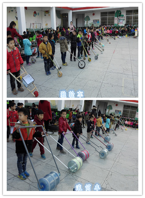 活动发起得到了广大家长的大力支持与配合,家长和孩子共同创意、制作,利用废纸板箱、可乐罐、饮水筒、旧轮胎、废木料、竹子等废旧材料制作出上百种近300件作品。这些自制的作品丰富多彩,五花八门,无论在选材、构思还是制作上,都令评委老师们叹为观止。一些在常人眼里一文不值的废品到了家长手里却变成了孩子爱不释手的运动器械。有用米袋、木棍做成的轿子,既锻炼手臂力量,又可以提高幼儿运动中的合作能力;废弃的旺仔牛奶瓶包起来就变成了梅花桩,以锻炼孩子的平衡能力;空奶粉桶加上一根旧棒子变成独轮小推车、木板下面加上万向轮和绳子变成小拉车,锻炼孩子的臂力以及奔跑能力;还有旧轮胎中央网上绳子变成孩子们喜爱的蹦床、床单变成袋鼠跳袋以锻炼孩子的跳跃能力;木棒和大饮料瓶做成的杠铃锻炼孩子们的手臂肌肉;还有利用其它废旧材料做成的拉力器、曲棍球、篮球架、跨栏、高跷等等。这些器械不但能发展幼儿跨、跳、投掷等各项基本动作,同时还将环保与艺术融为一体,整体性强,充分体现了家长们的聪明才智。