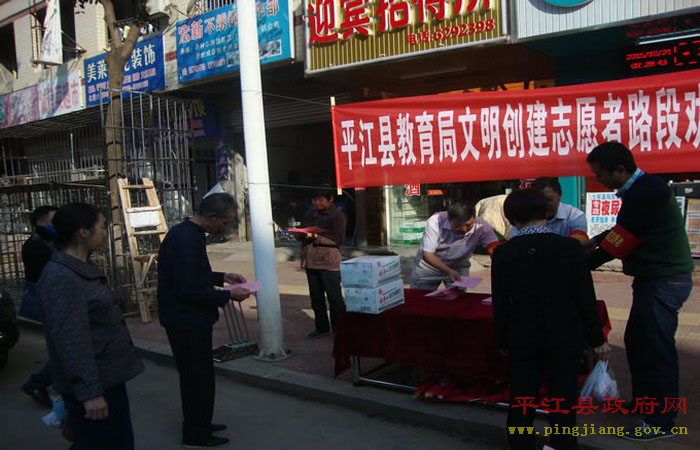 据了解,县教育局还统一印制了《平江县教育系统文明城市创建倡议书》两万余份,分别下发至城区学校,向家长宣传文明创建知识,并要求学生与家长一起学习。10月24日,平江一中、平江二中、平江职校组建的平江县教育系统系统文明劝导志愿服务队,将分别在城区彭德怀铜像广场、鲁家坪、新汽车站、天岳广场等城区主要公共区域开展文明劝导和倡议书发放等志愿服务活动。