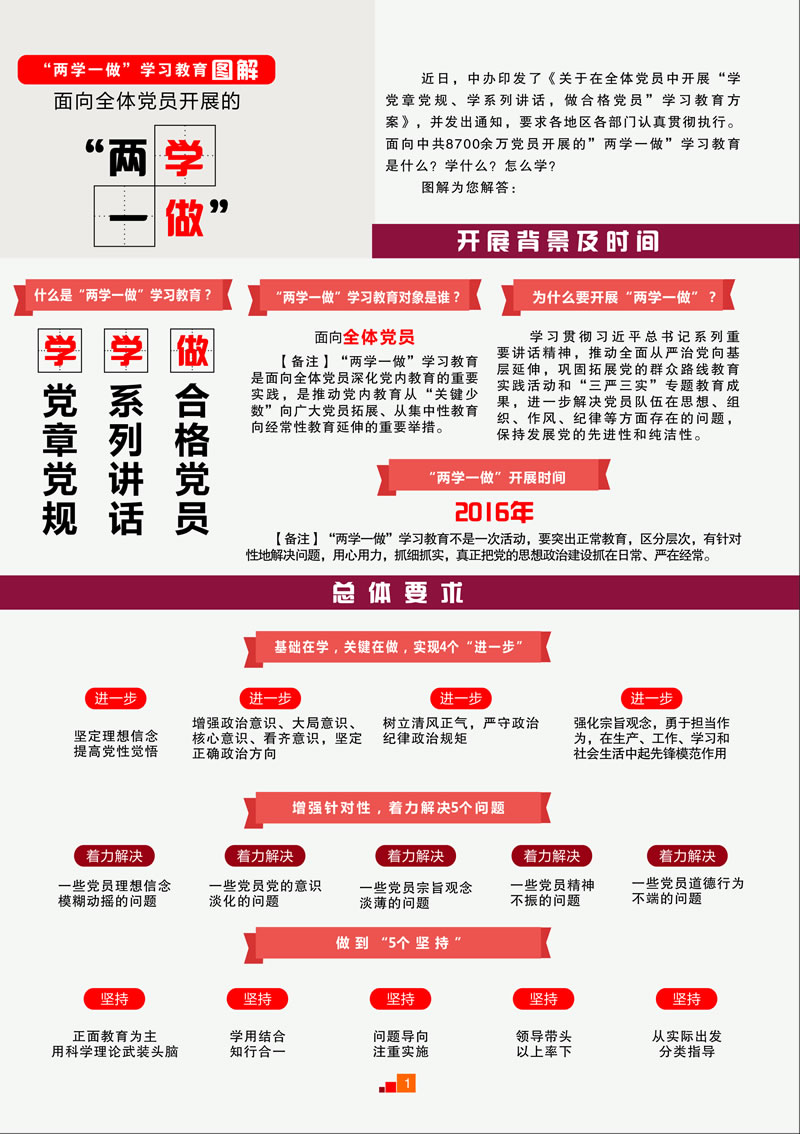 “两学一做”宣传画册从“两学一做”开展的背景及时间、总体要求、学习教育内容、主要措施和组织领导等方面进行图解,让党员看后便明白学什么,如何学,重点是什么,要求是什么。