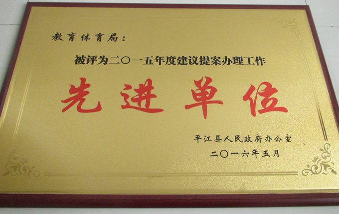 5月6日,县政府办公室印发《关于表彰2015年度建议提案办理工作先进单位和先进个人的通报》,县教育体育局荣列榜首,获“2015年度议案办理工作先进单位”称号。