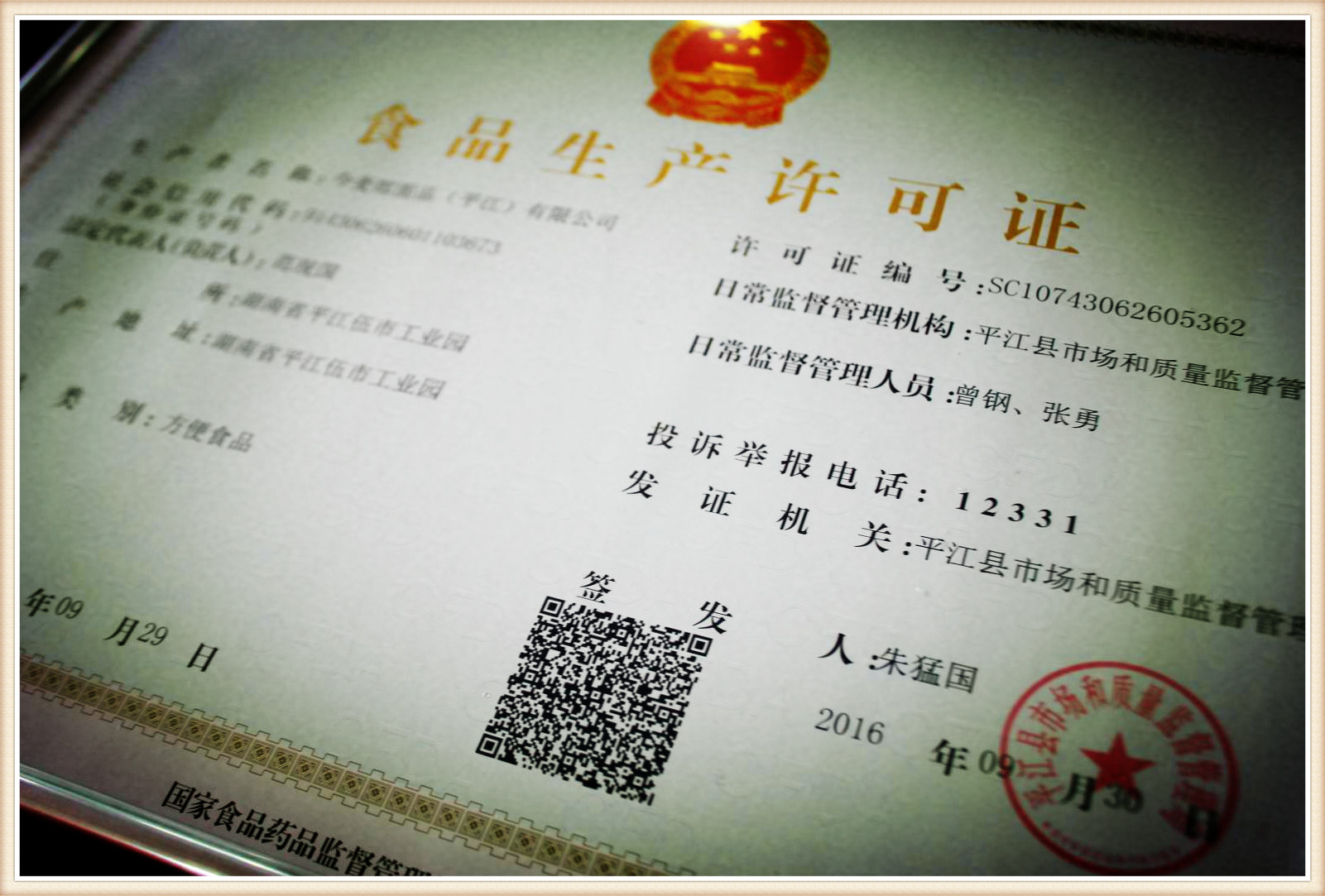 9月30日,平江县市场和质量监督管理局向今麦郎面品(平江)有限公司颁发《食品生产许可证》。这是全市首份以县级局名义核发的《食品生产许可证》,标志着省食品药品监督管理局赋予省直管试点县食品生产行政许可审批权限在我县正式实施。