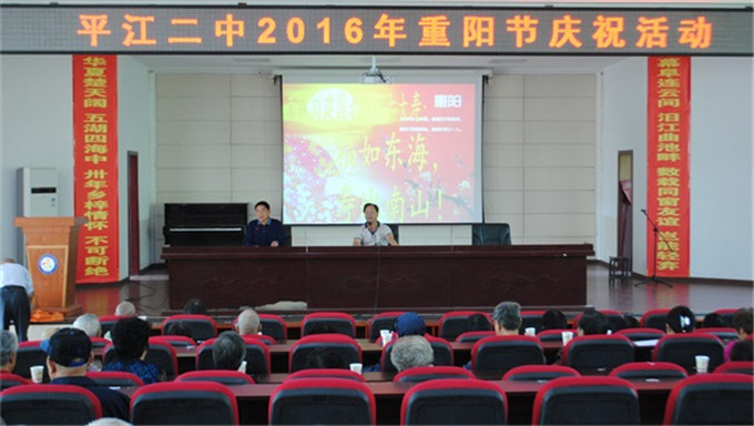 岁岁重阳,今又重阳。10月9日上午,平江二中重阳节庆祝活动在学校报告厅举行。60多位离退休老同志和学校领导何进、凌永康、袁电玲、李宇新欢聚一堂,共庆节日。