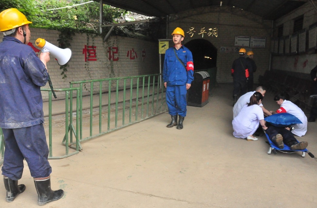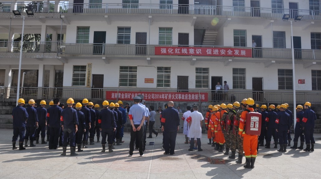 为认真贯彻落实国家安监总局关于认真组织开展应急救援预案演练活动的通知精神,切实做好事故应急救援工作。湖南黄金洞矿业组织相关部门、单位进行了一场大规模的矿井火灾事故应急救援演练,演练模拟华家湾工区金塘1#斜井-20中段通风平巷,电焊作业人员在维修焊接风门时,火花不慎引发旁边木材起火,导致1人烧伤,1人因有害气体中毒;火势及有害气体有进一步蔓延和扩散的趋势,情况危急,急需救援。