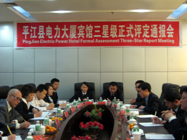 12月8日,岳阳市旅游饭店星级评定委员会对电力大厦宾馆的住宿、餐饮及其它配套设施,在认真检查的基础上,按照宾馆评星办法逐项进行了量化打分后,被评为三星级宾馆。 评星小组认为,电力大厦宾馆地处著名的将军之乡、平江起义的发生地—岳阳市平江县天岳经济开发区,紧邻汨罗江,地理位置与环境非常优越。设计美观大方,环境优雅,设施齐全,是集住宿、接待、旅游观光、餐饮于一体的大型宾馆,符合三星级宾馆标准。通过这次的评星,标志着平江县旅游接待服务水平有了进一步提高。