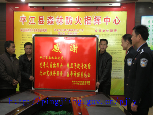 “虎年之首擒顽凶,蛛丝马迹寻迷踪;民妇冤魂得昭雪,森警神探赛包公。”2010年2月24日上午,春节后上班的第三天,平江县森林公安局收到了这份“大礼”。这是死者家属为感谢森林民警放弃春节休息时间,全力以赴,潜伏50个昼夜,成功侦破一起故意杀人案,将杀人疑犯辑拿归案,为家属申冤,为死者昭雪送来的感谢匾。