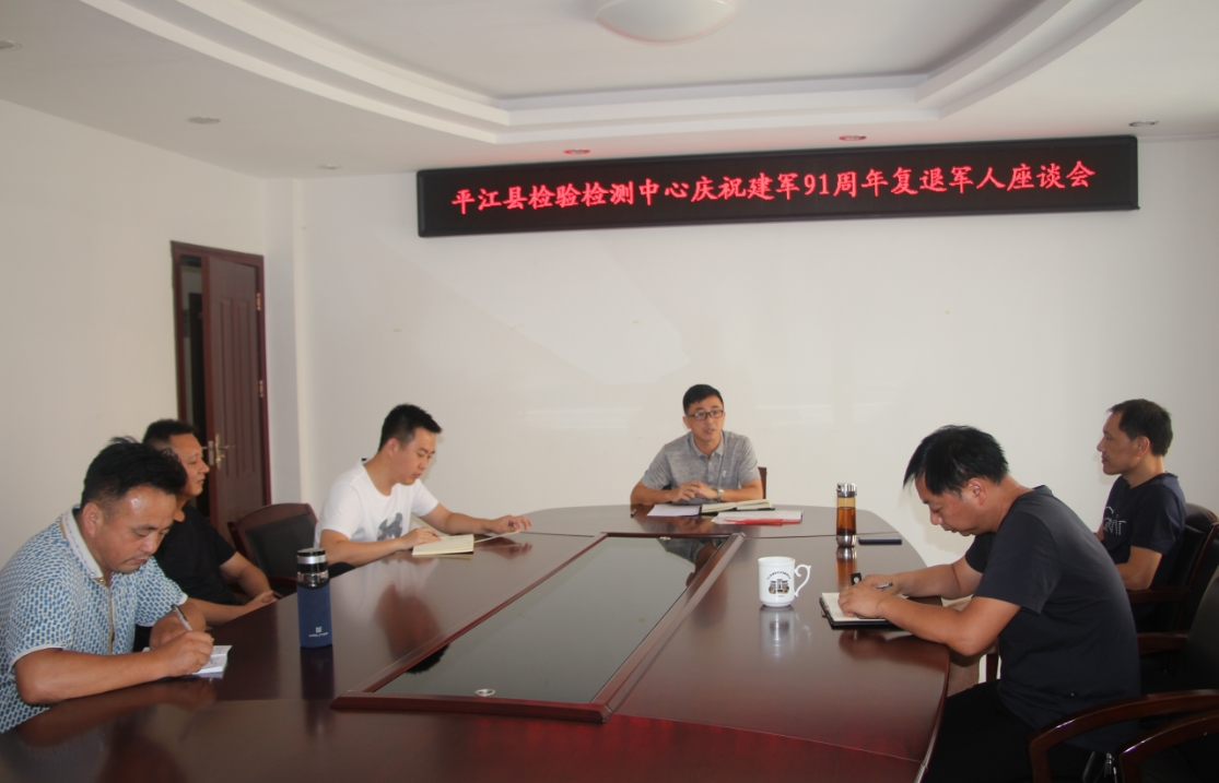 7月30日下午,县检验检测中心召开庆祝建军91周年复退军人座谈会,会议由中心党组成员、副主任李文忠主持,中心工会主席、政工人事股长余丽亚和全体复退军人参加。