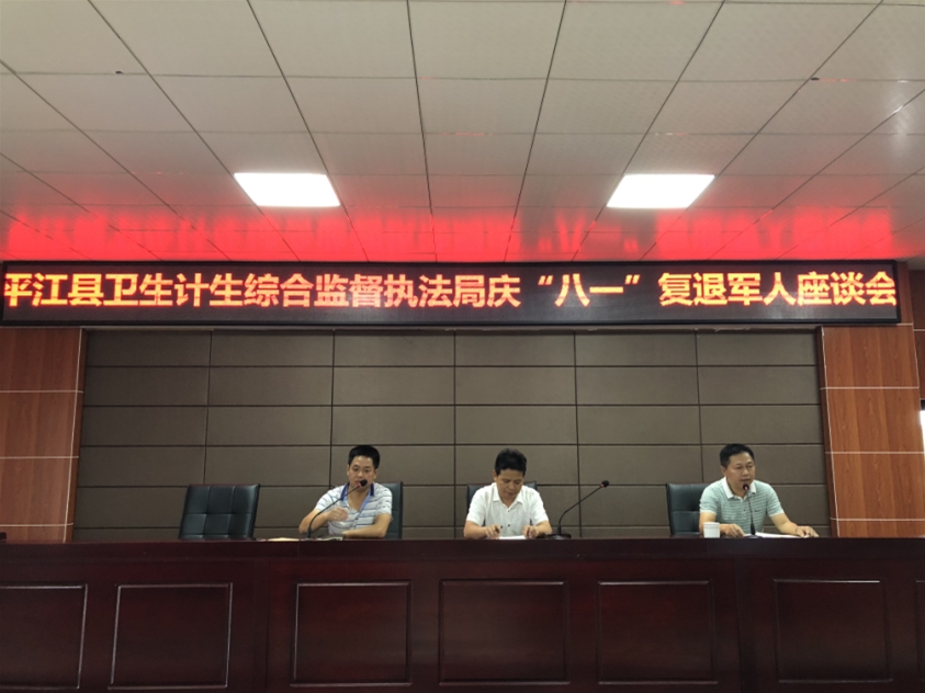 座谈会在轻松、融洽的气氛中圆满结束,大家纷纷表示,将继续发扬军人的优良传统,保持军人本色,倍加珍惜当前的一切,恪尽职守,爱岗敬业,为平江县卫生计生综合监督执法的发展做出新的更大贡献。(杨青海)