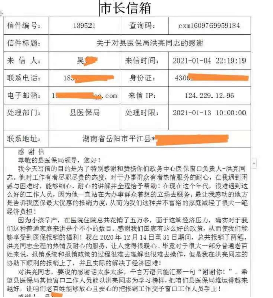 2021年新年上班的第一天,县行政审批局医保服务窗口负责人洪亮收到一份特殊的新年礼物——一封来自“12345”公众热线的表扬信。