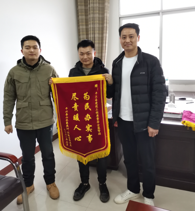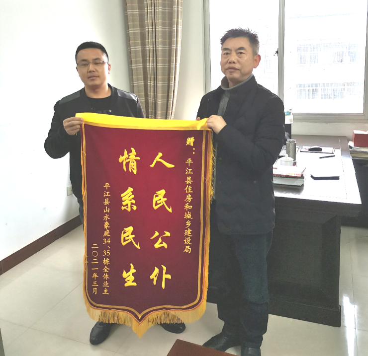 3月5日上午,平江县“海盟·山水豪庭”34、35栋业主代表将两面写有“人民公仆、情系民生” “为民办实事、尽责暖人心”的锦旗送至县住建局,对县住建局质安站工作人员在质量问题维权过程中尽职尽责、热情周到的服务,表示赞扬和诚挚感谢。