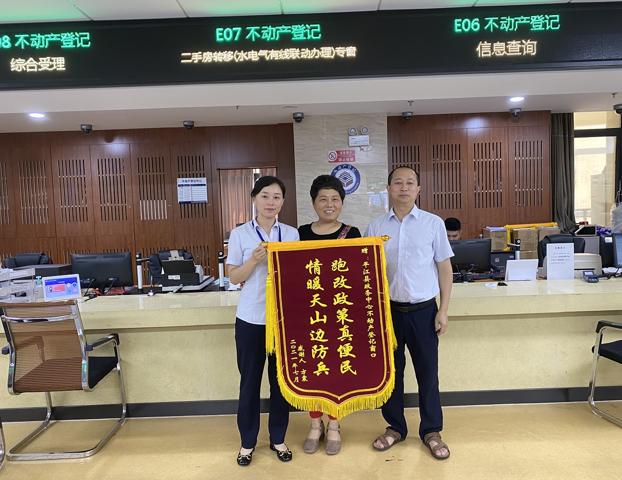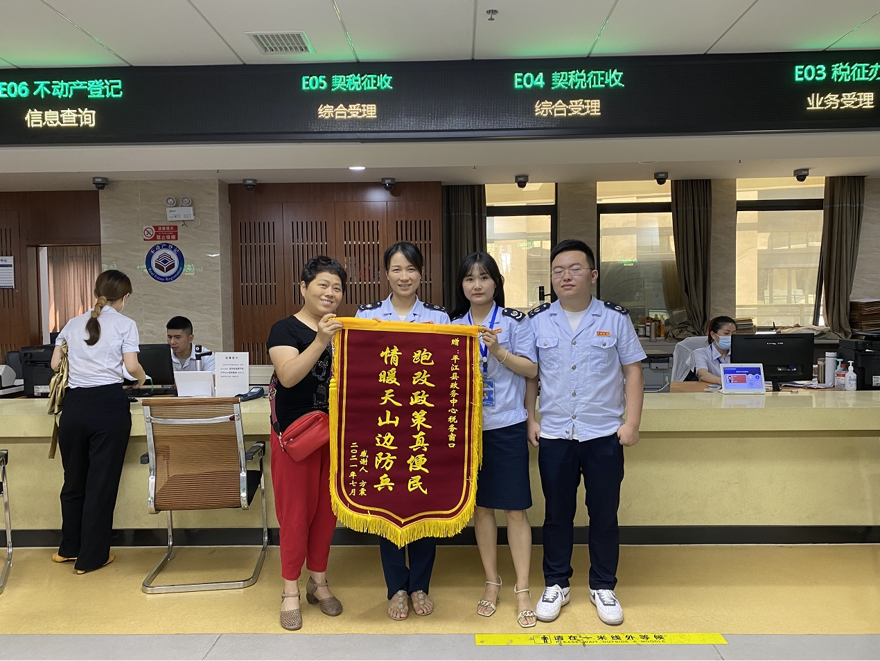 7月15日,正在新疆某兵团服役的边防战士方震委托其姨母给县政务服务大厅税务窗口和不动产登记窗口送来“跑改政策真便民,情暖天山边防兵”锦旗。